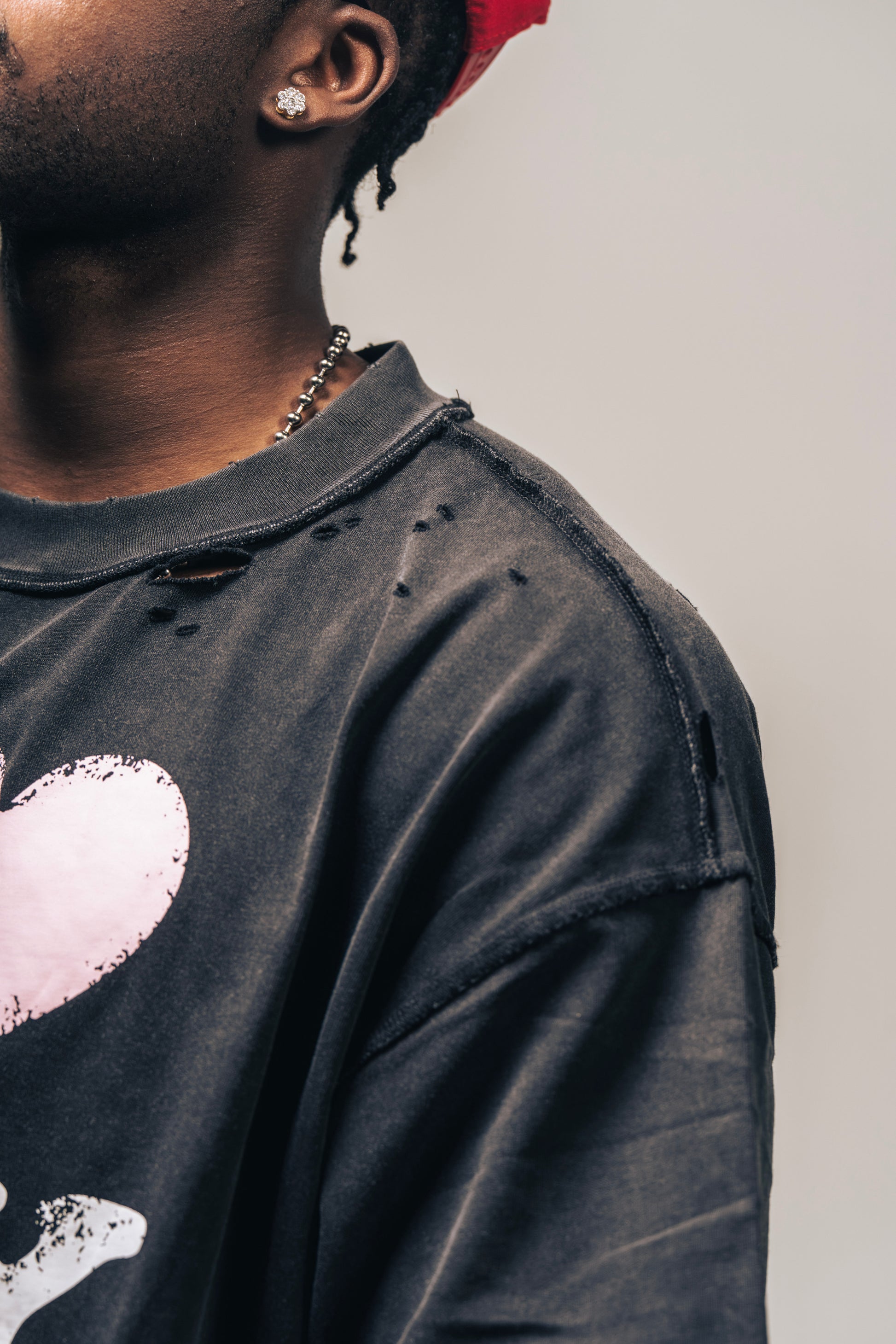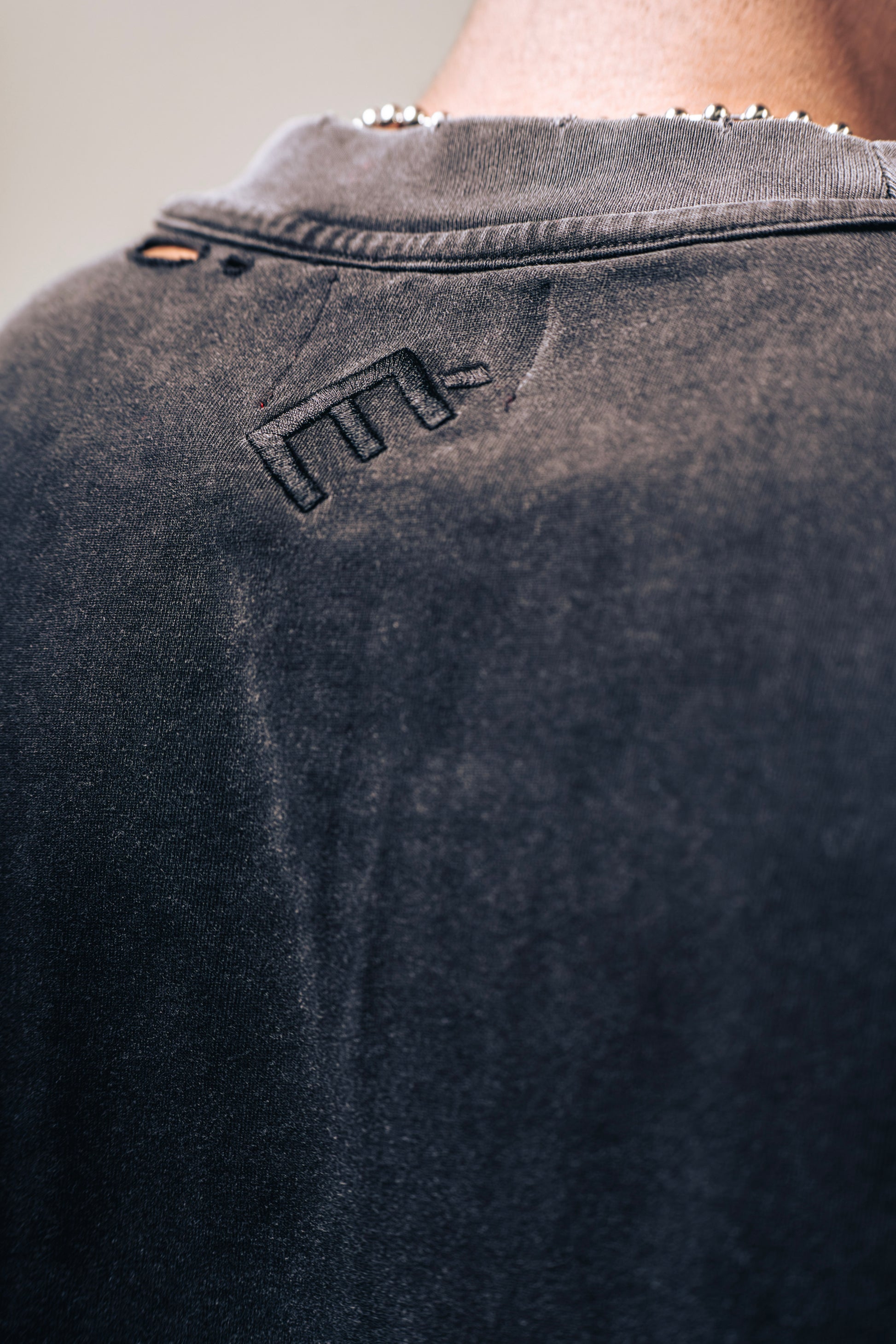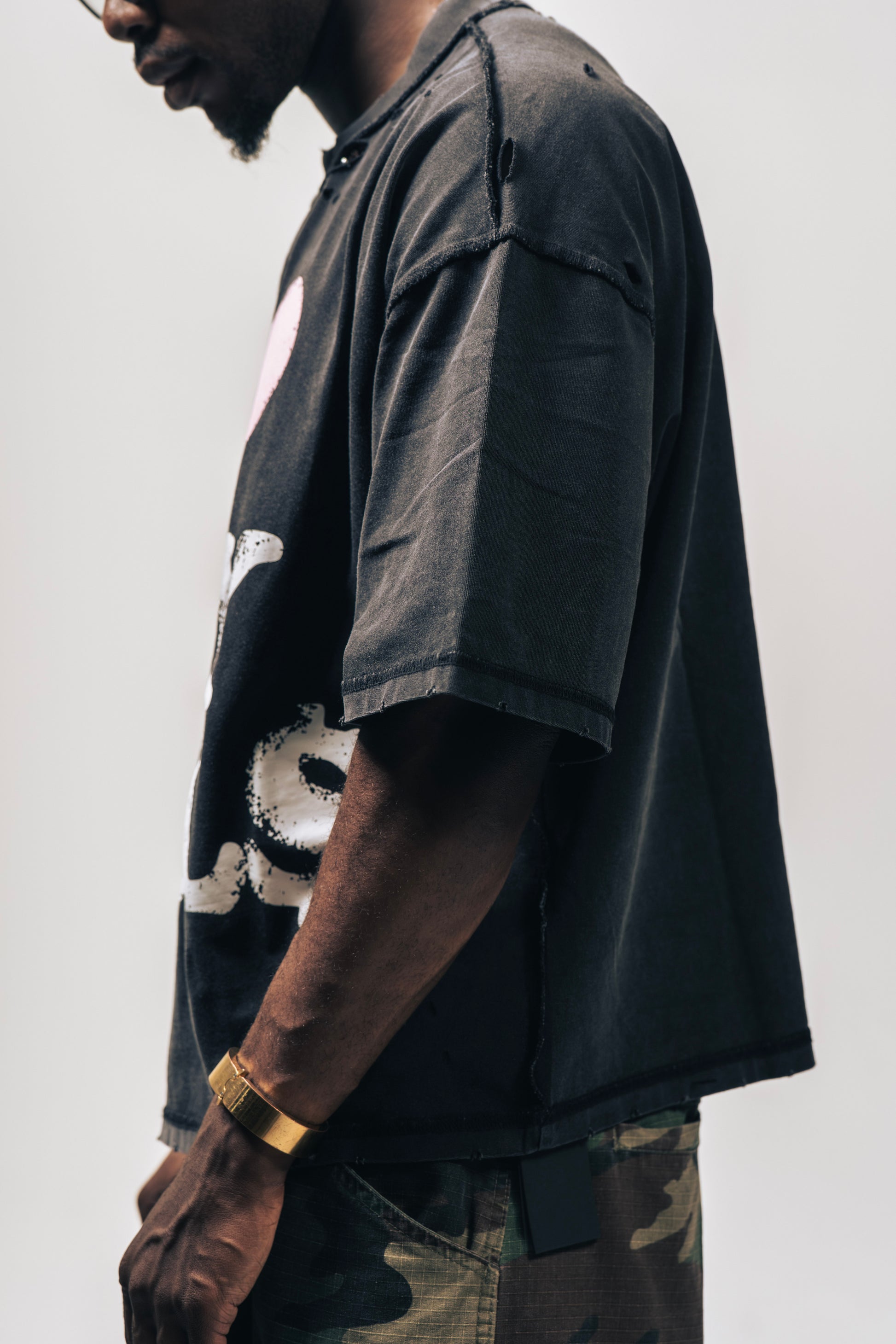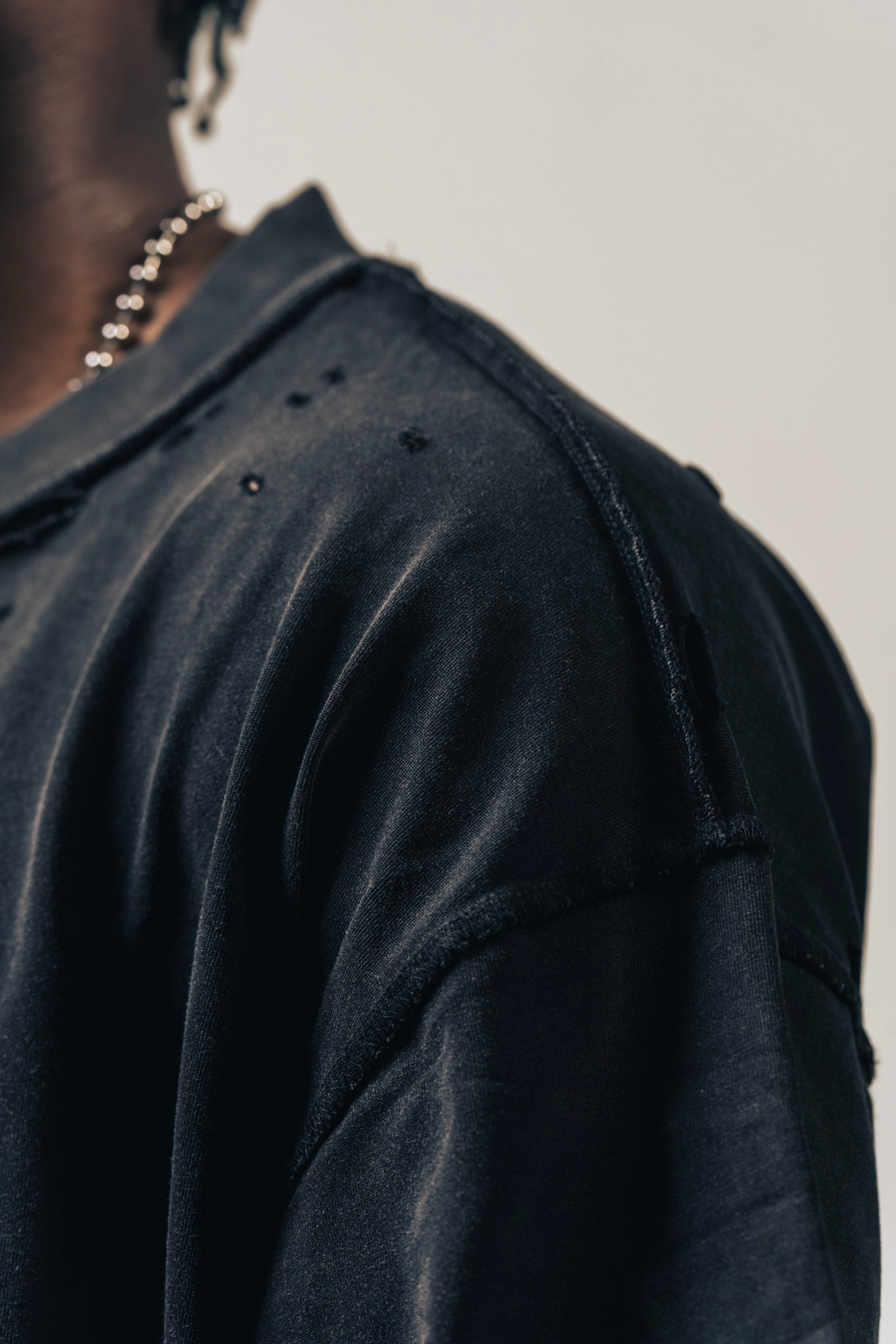 Cut from 260GSM heavyweight cotton in a cropped box silhouette. Distressed edges. Exposed seams. The color is a muted vintage black — worn-in like a secret everyone knows but few get to hold. It feels like it’s been yours since the first step.